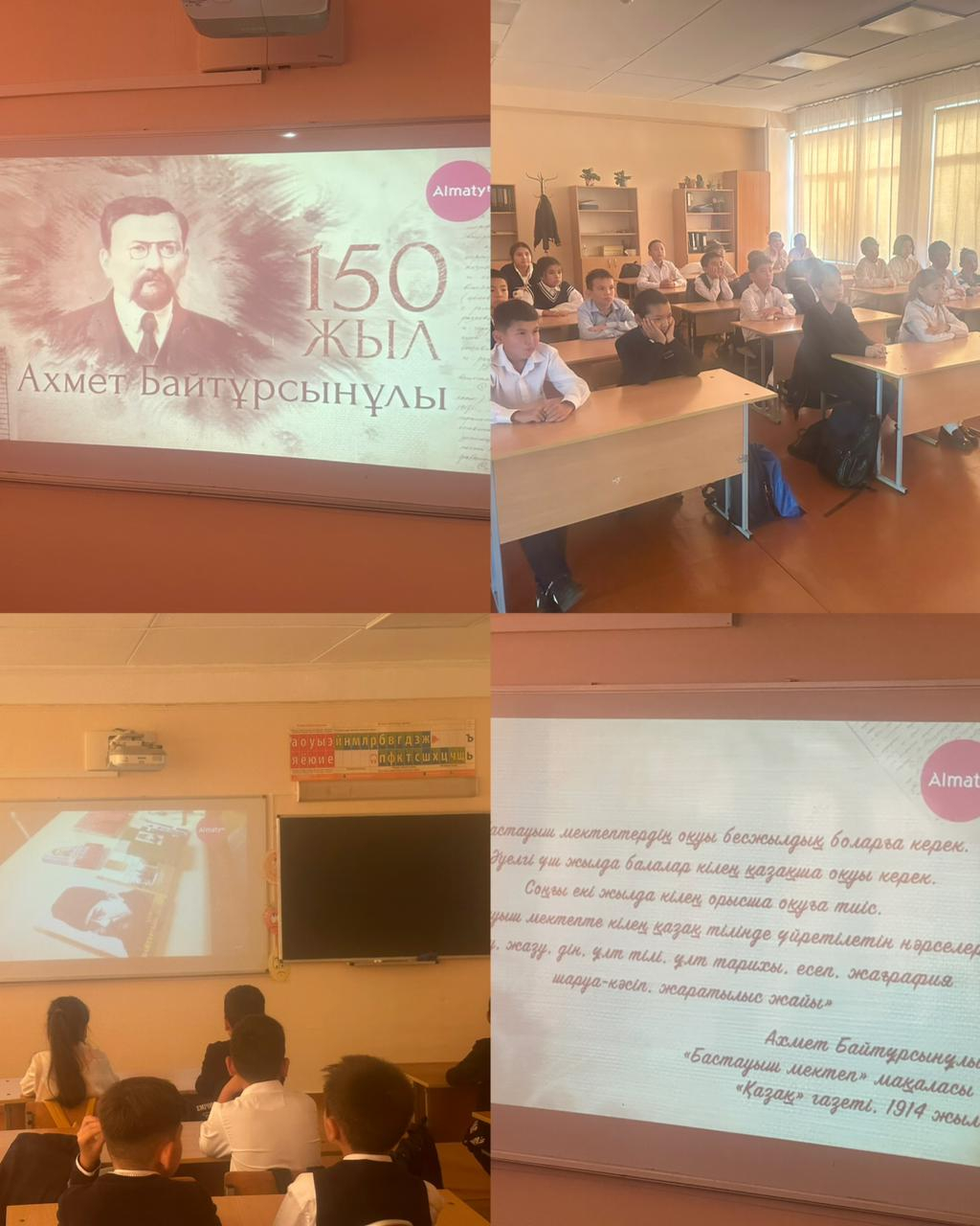 07.09.2023 жылы Ахмет Байтұрсынұлының туған күніне орай, 5Ә сыныбымен «Ахмет Байтұрсынұлы - ұлт ұстазы» сынып сағаты өткізілді.