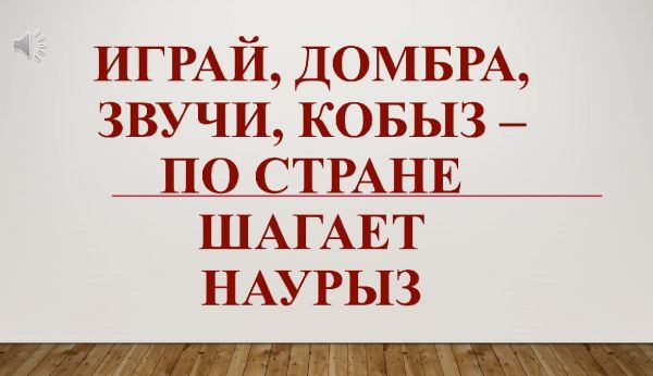 «Күмбірле домбыра, ойна қобыз– еліме келді Наурыз! – Играй, домбра, звучи, кобыз – по стране шагает Наурыз».