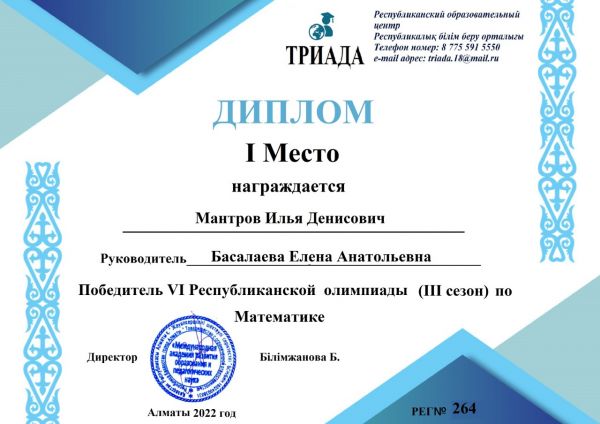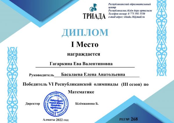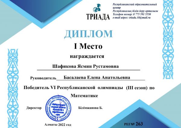 Ученики 1"А" класса стали победителями 4-ой Республиканской олимпиады ТРИАДА (3 сезон) по математике. Заняв 1-ые места.