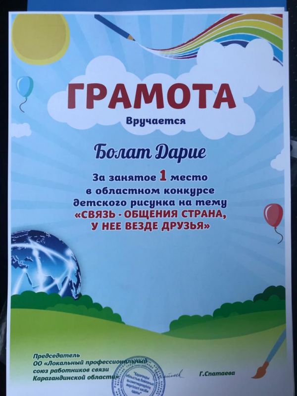 Поздравляем Болат Дарию -победительницу конкурса детского рисунка "Связь-общения страна, у нее везде друзья"