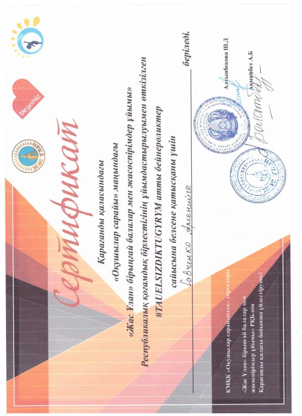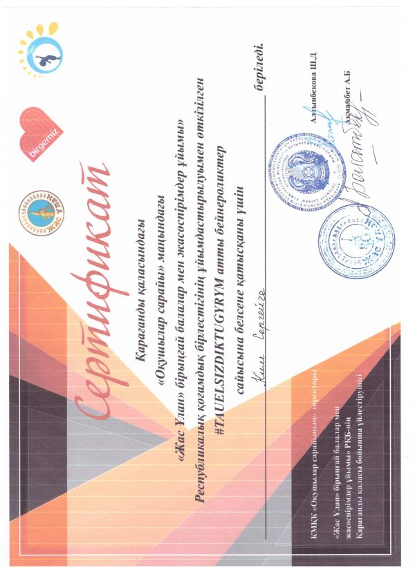 "TAUELSIZDIKTUGYRYM" атты бейнероликтер сайысына қатысқаны үшін сертификат пен алғыс хат берілді