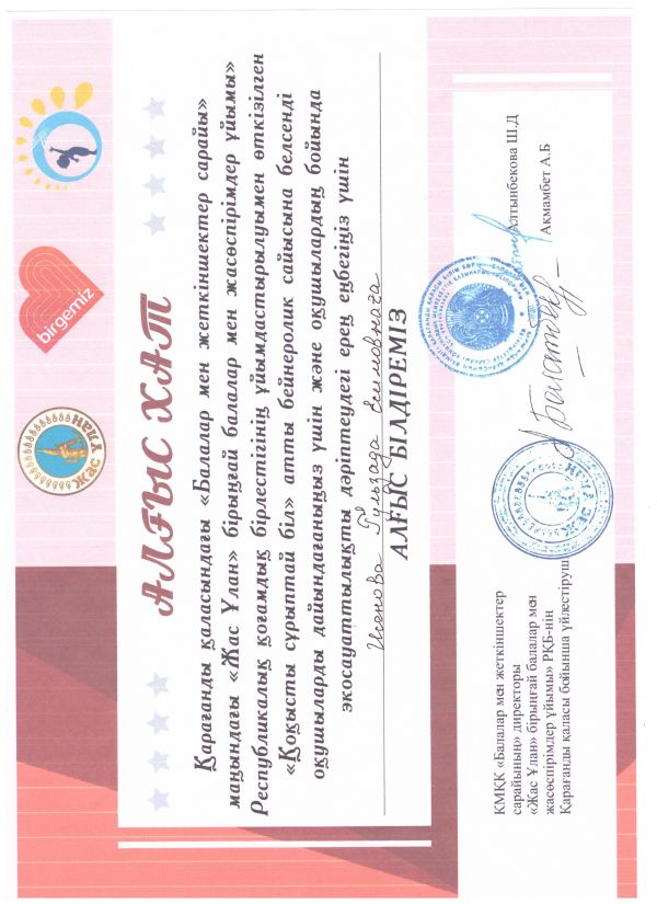 "ҚОҚЫСТЫ СҰРЫПТАЙ БІЛ"атты бейнероликтер сайысына қатысқаны үшін