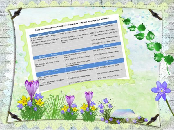 Итоги городского Фестиваля инклюзивного творчества "Чудеса из ненужных вещей". 1 место - Кәбидет Н ученик 7 "Ә" класса, 2 место - Смагулова Т. ученица 3 "В" класса.Итог…