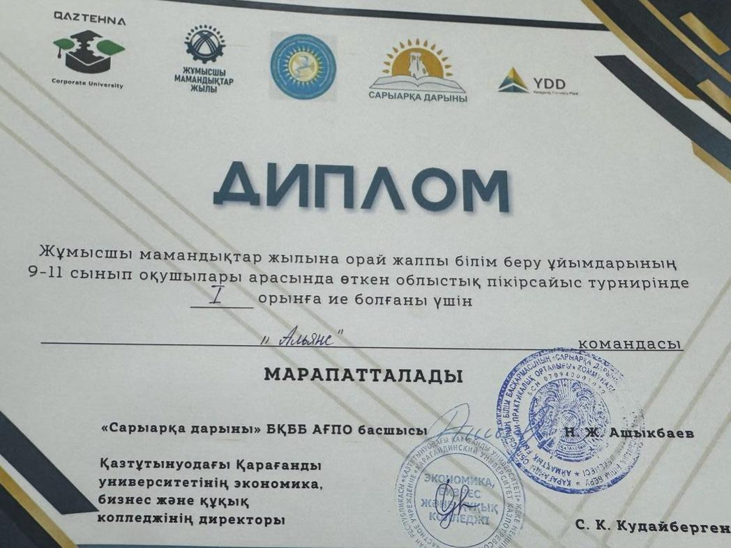 Ученицы 11 «А» класса Смагулова Акниет и Пудеева Аяна заняли 1 место среди 50 команд в областном дебатном турнире