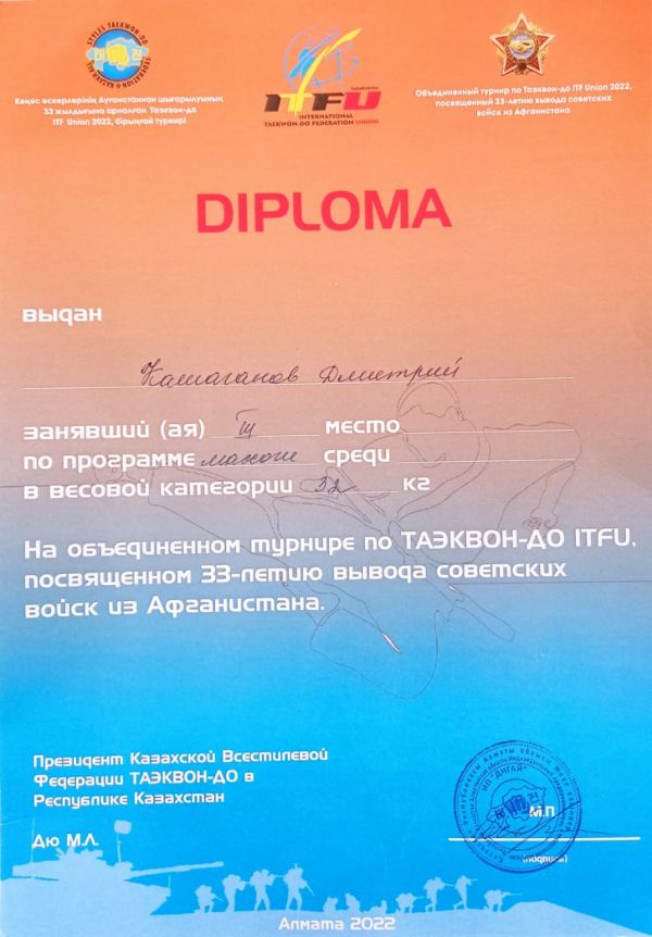 Кашаганов Дмитрий ученик 1 "В" класса занял 3 место в городском турнире по таэквон-до ITF.