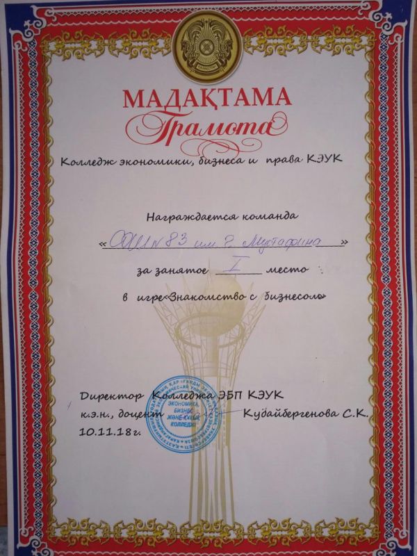 10 ноября 2018 годасовместно с Палатой предпринимателей Карагандинской области и Кооперативным колледжом прошла игра "Знакомство с бизнесом". Наши учащиеся заняли 1 место.