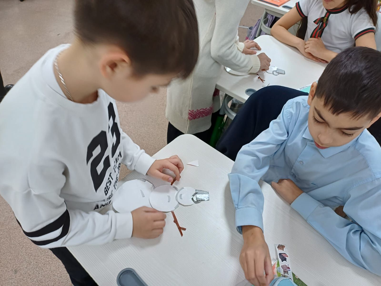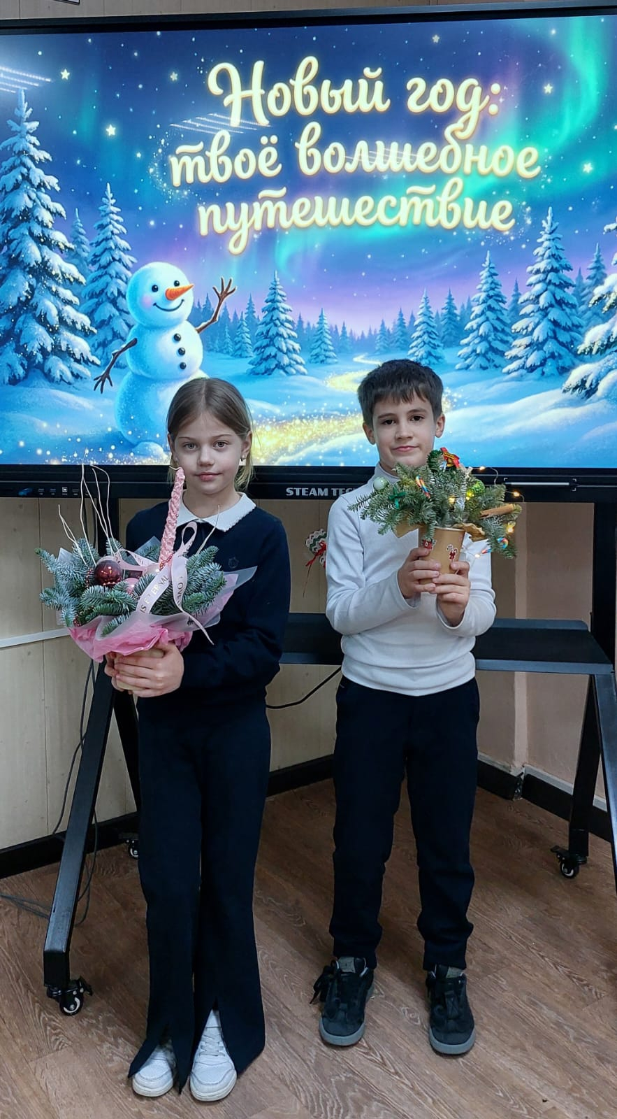 В нашей школе проходит новогодняя выставка поделок среди учащихся 1–2 классов. Среди участников — Калашиди Демис и Крылова Есения, учащиеся 2 «А» класса, которые представили икебаны из еловых веточек и огоньков. Эти праздничные композиции стали настоящим