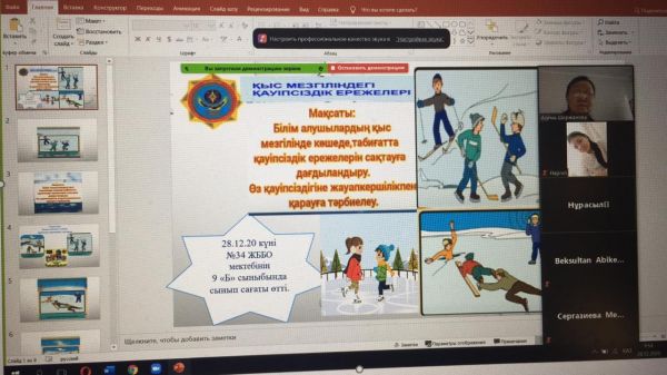 28.12.20 күні №34 ЖББО мектебінің 9 "б" сыныбында "Қысқы қауіпсіздік ережелері" тақырыбында сынып сағаты өтті.