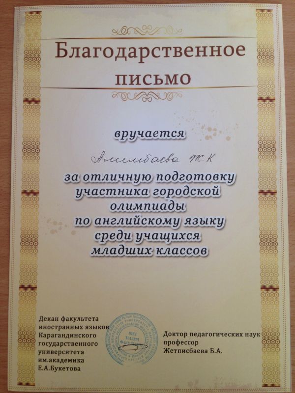 Третьего ноября 2014 года в Гимназии №93 прошла городская олимпиада по английскому языку среди учеников начальных классов. Организатором олимпиады был КарГУ имени Е.А.Букетова. Из ОСШ №34 участвовал…