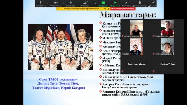 12.04.21 күні №34ЖББМ 9 „А“ сынып оқушыларымен сынып сағаты өтті. Тақырыбы: „12 сәуір ғарышкерлер күні„