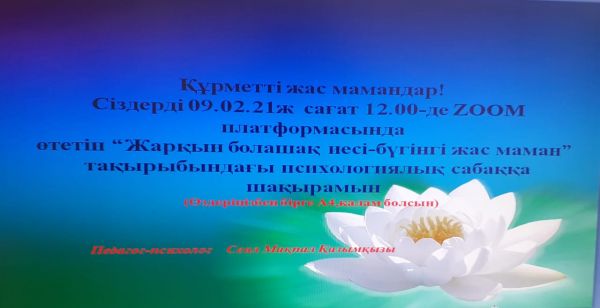 Жас мамандармен Zoom платформасында "Жарқын болашақ иесі-бүгінгі жас маман" тақырыбында психологиялық сабақ өткізілді.