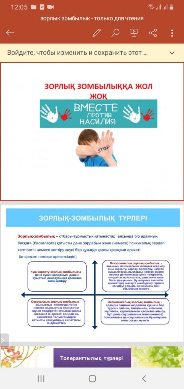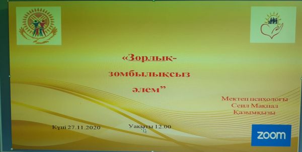 .Оқушыларға зорлық-зомбылық туралы мағлұмат беру, адамның жаны мен тәніне үлкен зардап әкелетін соққы екенін түсіндіру мақсатында 7-сынып оқушыларымен "Зорлық-зомбылықсыз әлем" тақырыбында…