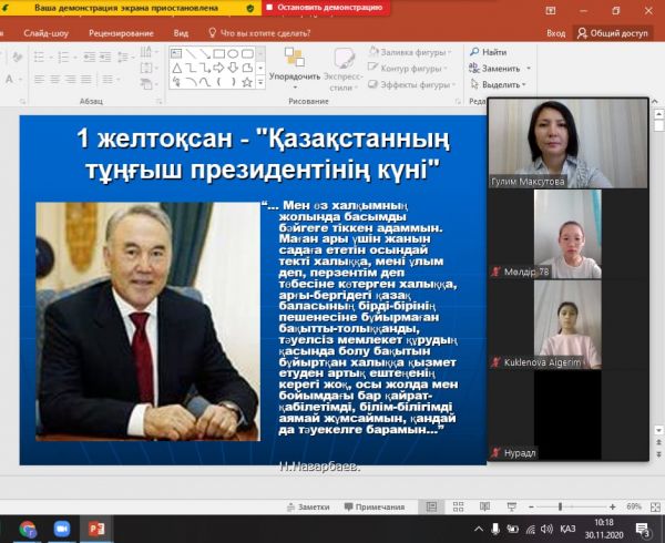 30.- қараша №34 ЖББОМ-нің 9"а","ә"сыныптарымын Тұңғыш Президент күніне арналған сынып сағаты өтті.