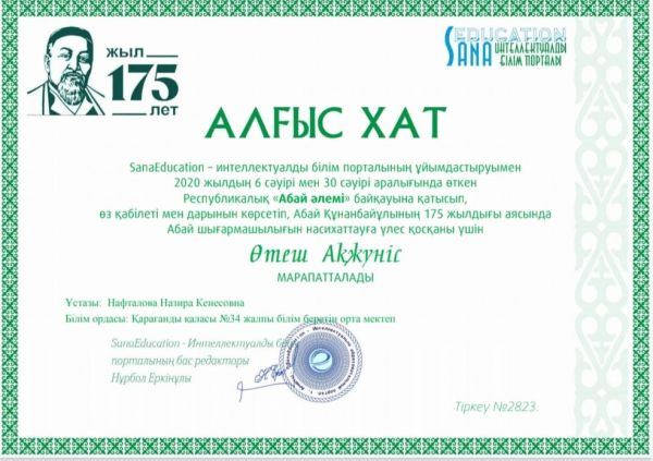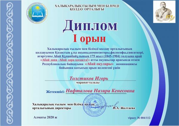 Халықаралық ғылым мен білімді қолдау орталығы ұйымдастырған Абай Құнанбайұлының 175 жыл толуына орай "Абай дана-Абай дара қазақта!" Республикалық Абай оқуларына 8 Г оқушысы Толстиков…
