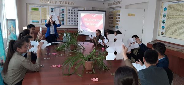 17.10.2019 жылы №34 ЖББОМ-тің 11-сынып оқушыларымен бақытқа қол жеткізе алатынына сенім туғызу және өмірге құштарлықтарын ояту мақсатында "Бізді күтер бір бақыт" тақырыбында тр…