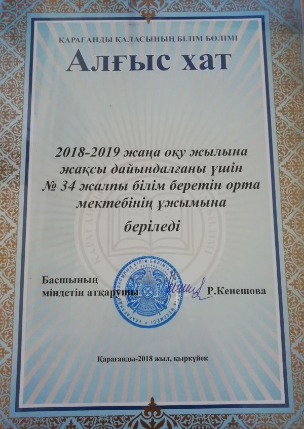 Отдел Образования города Караганды награждает коллектив СОШ №34 за отличную подготовку к новому учебному году!
