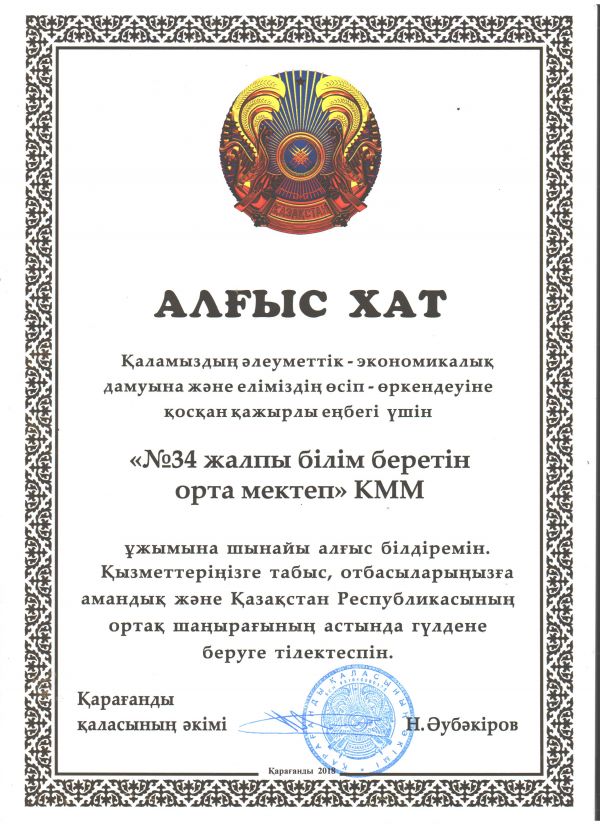 Қаламыздың әлеуметтік - экономикалық дамуына және еліміздің өсіп-өркендеуіне қосқан қажырлы еңбегі үшін "№ 34 жалпы білім беретін орта мектеп" ұжымы марапатталды.