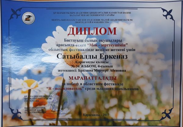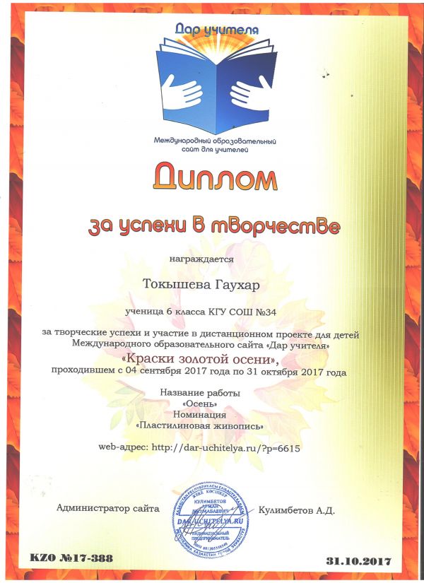 Учащиеся СОШ №34 Жмак Анна, Ивченко Олеся и Токышева Гаухар принимали участи в международном ворческом конкурсе "Краски золотой осени" и были отмечены грамотами за лучшие работы. Поздравля…