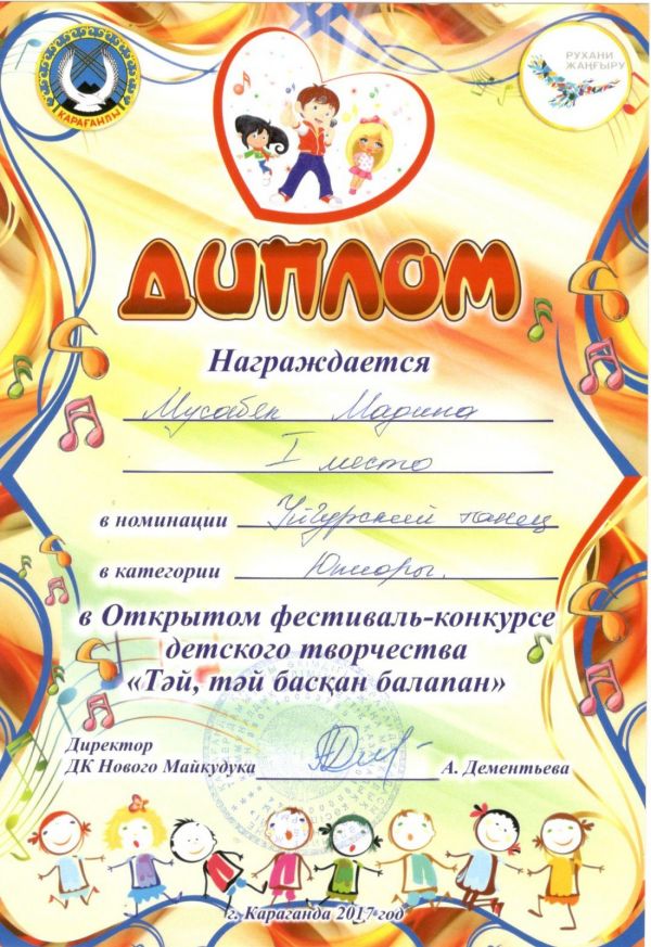 Майқұдық Мәдениет сарайында өткен «Тәй, тәй басқан балапан» атты байқауында №34 жалпы білім беретін орта мектептің 3 «В» сынып оқушылары Мұсабек Мадина және Елеукен Еркеназ б…