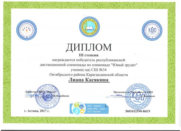 III дәрежелі диплом иегеріЖмак Аннаны және пән мұғалімі Ковшова Елена Михайловнаны КИО қашықтық олимпиадасында математика пәнінен жүлделі орнымен
