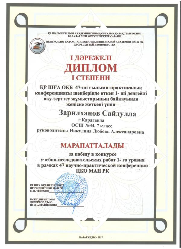 Учащийся 7в класса СОШ №34 принимал участие в конкурсе учебно-исследовательских работ 1-го уровня в рамках научно-практической конференции ЦКО МАН РК и занял 1 место. Руководитель: Никулина Любовь А…