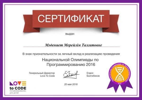 В знак признательности за личный вклад в реализацию проведения "Национальной Олимпиады по программированию 2016" учителя нашей школы: Д.С.Ақылтаеву, К.С.Бекишовой, А.К.Мусалимовой, М.Т.Мәд…