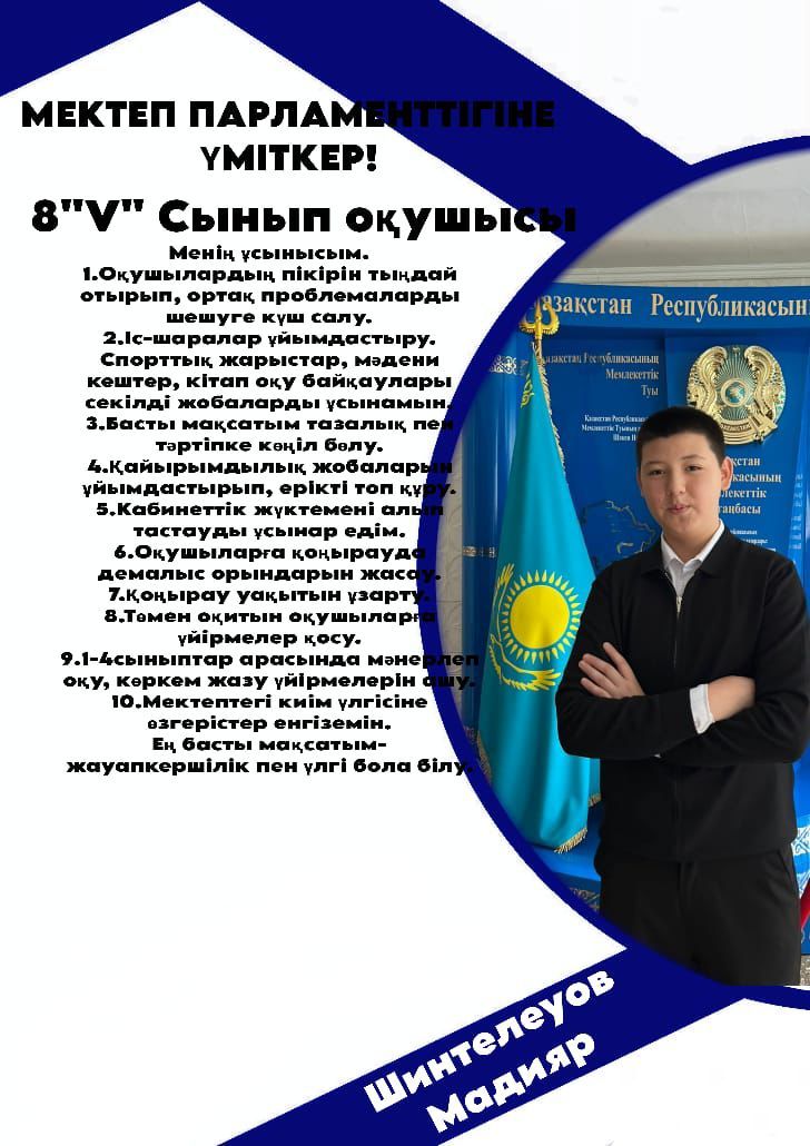 2025-2026 оқу жылында Мектеп Парламентінің президенттігіне үміткерлер сайлауы өтті. 7сайлау төрайымы өз жұмыстарын жүргізді. Дауыс беру әділ түрде өтті. Дауыс беру нәтижесінде: