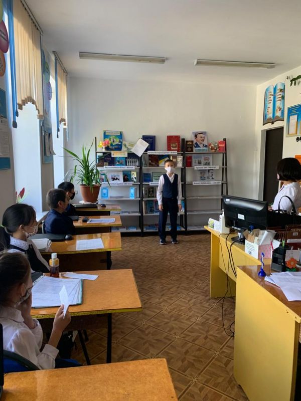 21.09.2021ж. №34 ЖББМ Мемлекеттік тіл саясатына ақпараттық қолдау көрсету тапсырмасы аясында мектебіміздің кітапханасында 5 ә сынып оқушыларымен орыс тілі және әдебиет пәні мұғалімі Ш.Н.Сулейменова…