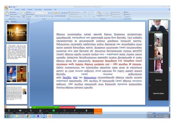 №34 ЖББМ КММ-нің 6 "б" сыныбында "Ядролық қарусыз Қазақстан" тақырыбында ZOOM платформасында сынып сағаты өтті. Мақсаты: Оқушыларға Семей өңірінде жүргізілген ядролық сынақ…