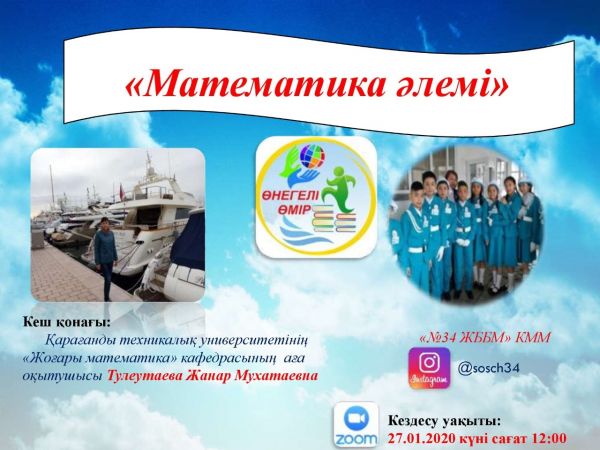 В рамках недели математической грамотности с учащимися 7-8 классов КГУ "СОШ №34" была проведена онлайн-встреча с успешными работниками в области математики. 27 января 2021 года была органи…