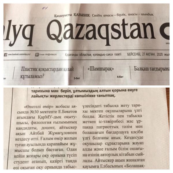 "Өнегелі өмір" жобасы аясында ҚарМУ-дың оқытушысы,айтыстың ақтаңгер ақыны Айтбай Жұмағұловпен кездесу барысын Қарағанды облыстық қоғамдық-саяси газетіне "Өнегелі өмірі-көпке үлг…