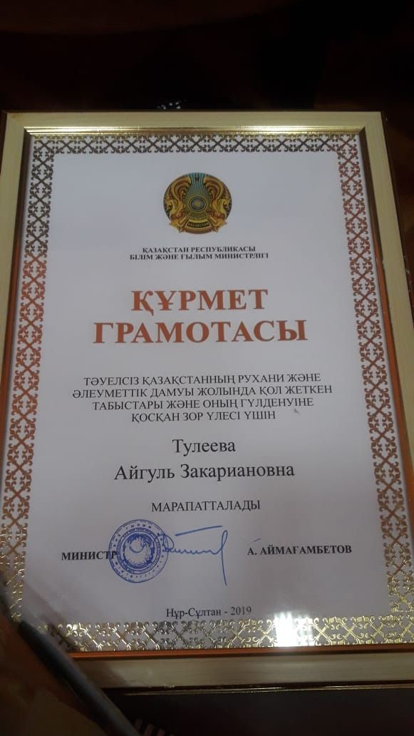 Тулеева Айгул Закариановнаны Білім беру Министрлігінің грамотасын алуымен құттықтаймыз