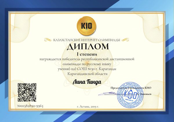 Орыс тілі пәнінен КИО республикалық қашықтық олимпиадада 1-ші және 3-ші дәрежелі дипломды иеленді.