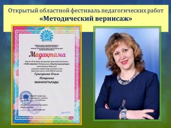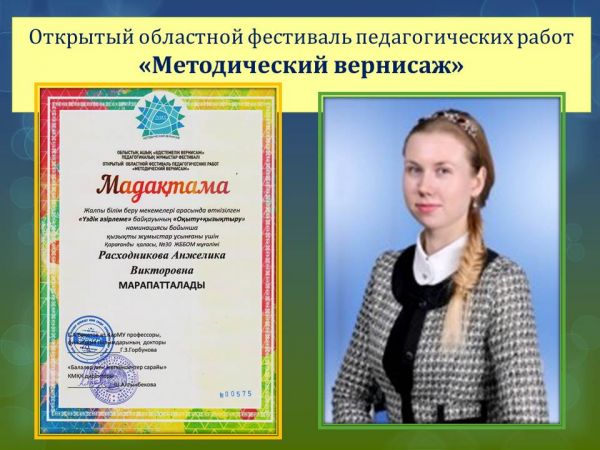 Тулеева Айгуль Закариановна педагогикалық жұмыстар бойынша «Әдістемелік вернисаж» Ашық облыстық байқауға белсене қатысып, мадақтау қағазын алды.