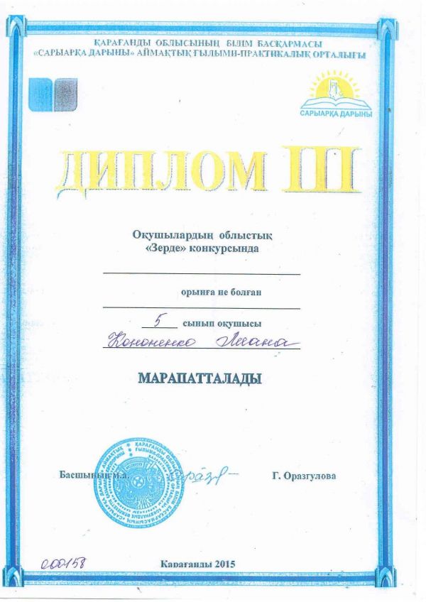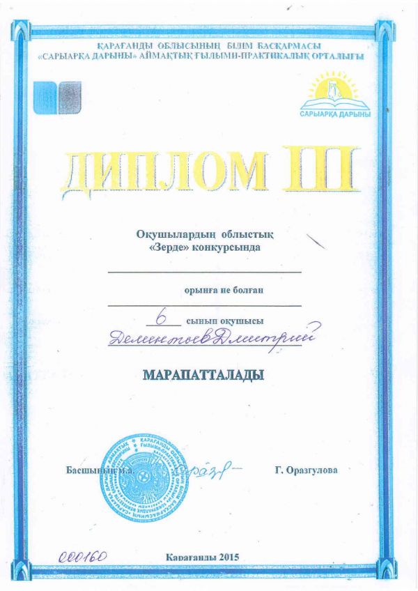 "Зерде" облыстық байқау жеңімпаздарын құттықтаймыз: 5 сынып оқушылары: Кононенко Лиана, Апачеву Дарина, Шестакова Анастасия, 6 сынып оқушылары: Дементьева Дмитрия!!Жетекшілері: Молостова С…