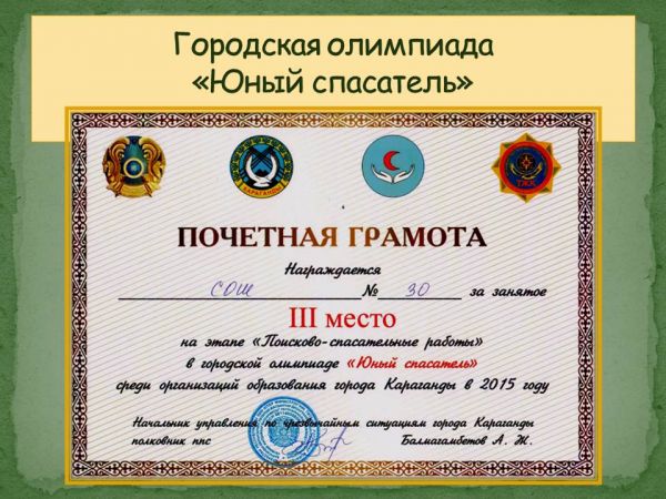 №30 ЖББОМ КММ 2015 жылы Қарағанды қаласының білім беру ұйымдары арасында "Жас құтқарушы" мектеп олимпиадасына белсене қатысқаны үшін жүлделі орынды жеңіп алды.