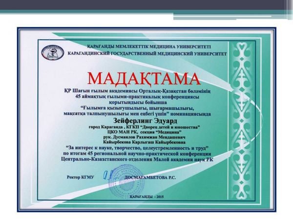 Валиев Максим ҚР Шағын ғылым академиясы Орталық-Қазақстан бөлімінің 45 аймақтық ғылыми-практикалық конференция қорытындысы бойынша "Ғылымға қызығушылығы, мақсатқа талпынушылығы мен еңбегі үшін&…