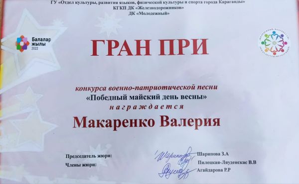 Поздравляем победителя конкурса военно-патриотической песни "Победный майский день весны" ученицу 2б класса МАКАРЕНКО ВАЛЕРИЮ.