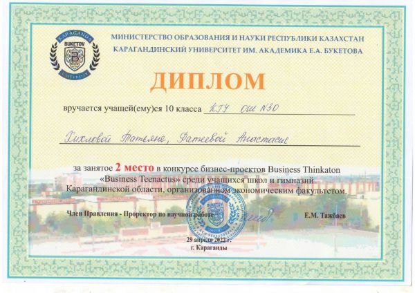 Поздравляем Фатееву Анастасию и Хихлову Татьяну с дипломом 2 степени в конкурсе бизнес проектов в КарУ им.Е.А. Букетова. Учитель Ковалевская О.Н