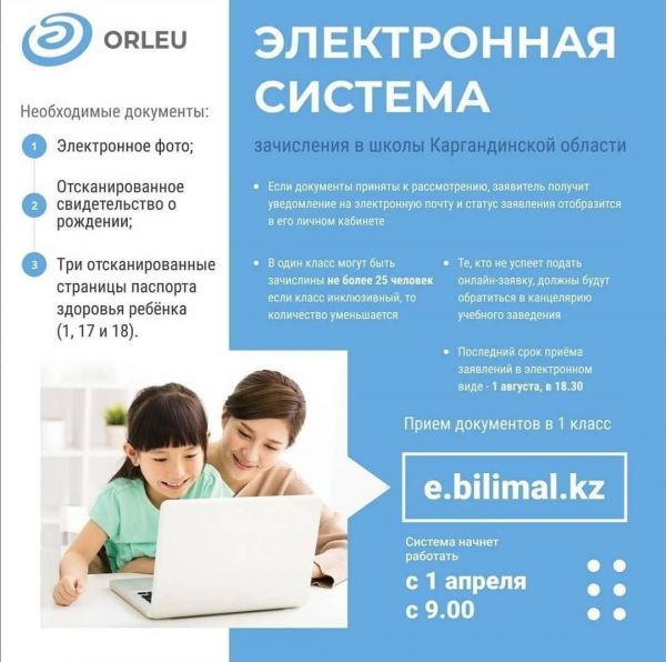 Бірінші сынып оқушыларының құжаттарын қабылдау 1 сәуірде басталып, 1 тамызға дейін жалғасады. Бұл – білім беру процесіне қатысушыларға ыңғайлы болу үшін қабылданған шешім.