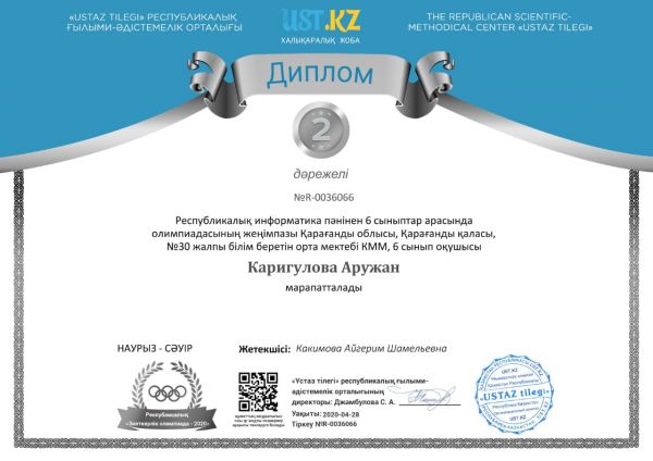 информатика пәнінен республикалық олимпиадада 2-ші дәрежелі диплом