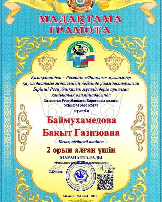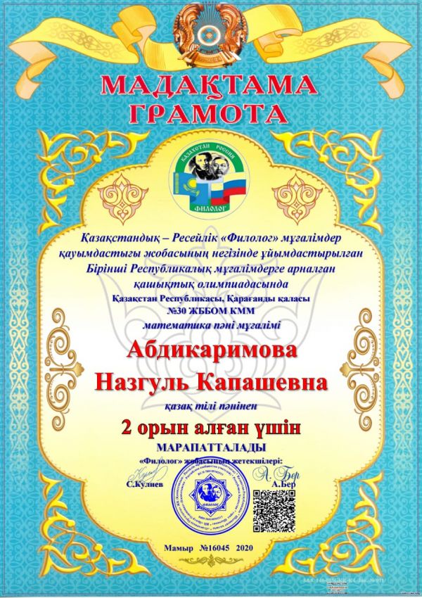 Қазақ тілі пәнінен 4-сыныптар арасында өткен Қарағанды облыстық олимпиадасында Маханкул Хадишаны 2-орынмен марапатталды. Құттықтауымызды қабіл ал!!