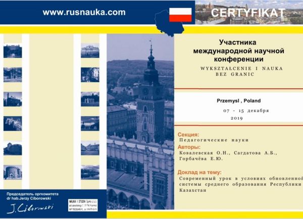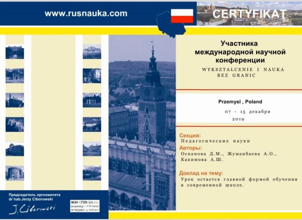 Оспанова Д.М., Жуманбаева А.О., Какимова А.Ш. халықаралық ғылыми-ғылыми конференцияға қатысты, мақала тақырыбы: «Сабақ заманауи мектепртегі негізгі оқыту нысаны болып қалады».