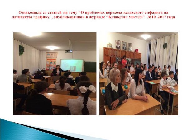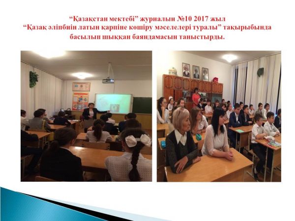 Қазақ тілі пәнінің мұғалімі : Г.А.Жумабекова “Қазақстан мектебі” журналын №10 2017 жыл “Қазақ әліпбиін латын қарпіне көшіру мәселелері туралы” тақырыбында басылып ш…