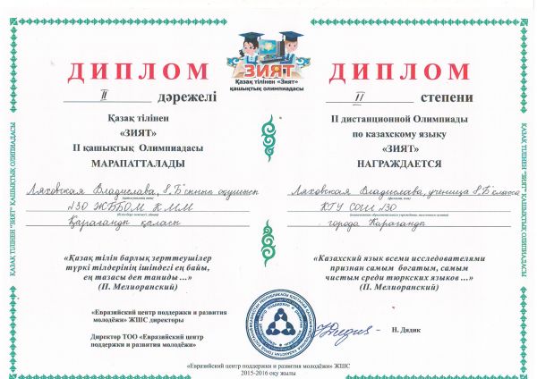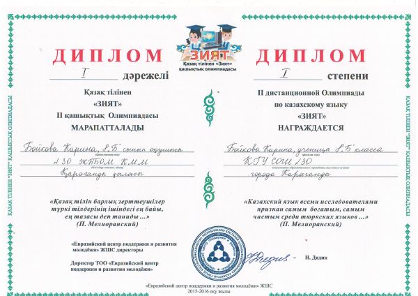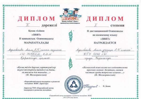 Біздің мектеп оқушылары қазақ тілінен "ЗИЯТ-2015" олимпиадасында жүлделі орындарды жеңіп алды: