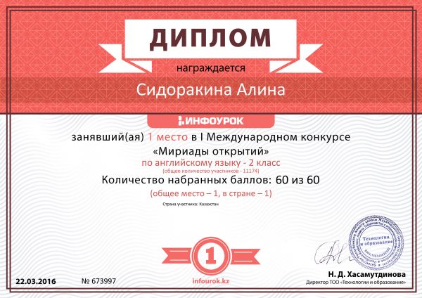 Орыс тілі мен орыс әдебиеті пәні мұғалімі Маневич Виктория Алексеевна "ДЕМИУРГ" педагогикалық олимпиадасында III дәрежелі диплом алды, орыс тілі.