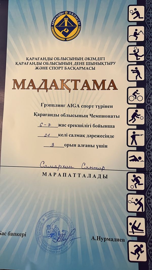 2 а сынып оқушы Самаркан Санжар Қарағанды облыстық Грэпплинг спорт түрінен Чемпионатқа қатысып, 3 орынды жеңіп алды. Жарайсың, құттықтаймыз!
