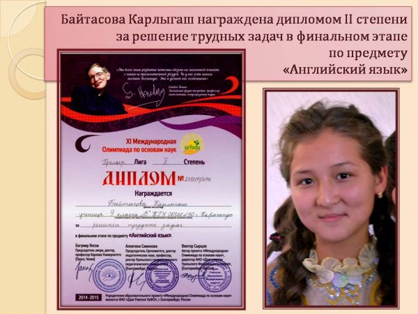 Губинова Анастасия ғылым негіздері бойынша XІ Халықаралық Олимпиадаға белсене қатысып, "Орыс тілі" пәні бойынша ақтық сында қиын міндеттерді шешкені үшін ІІ дәрежелі дипломмен марапа…