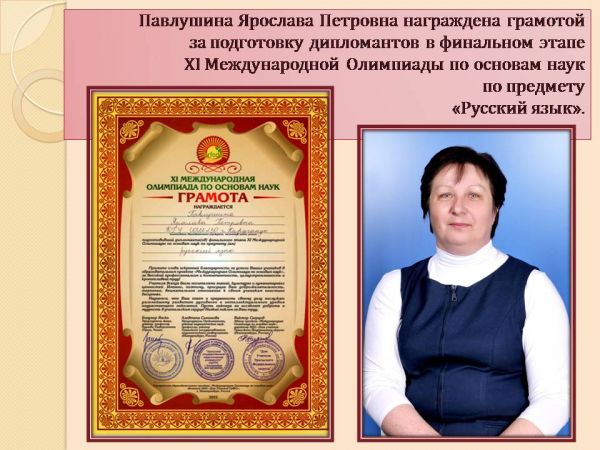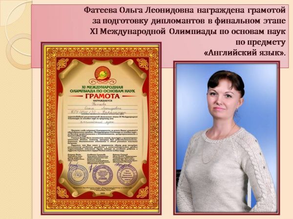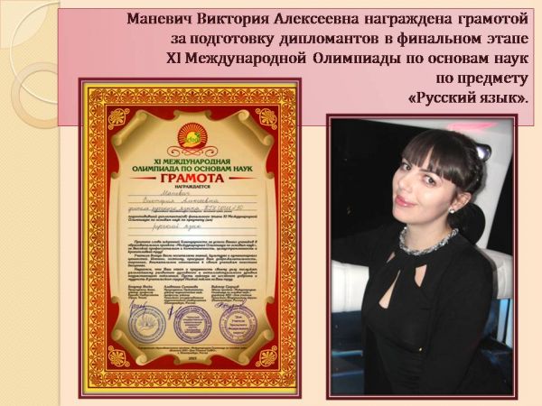 Шиповалова Виктория ғылым негіздері бойынша XІ Халықаралық олимпиадаға белсене қатысып, "Ағылшын тілі" пәнінен ақтық сыңда қиын міндеттерді шешкені үшін ІІ дәрежелі дипломмен м…