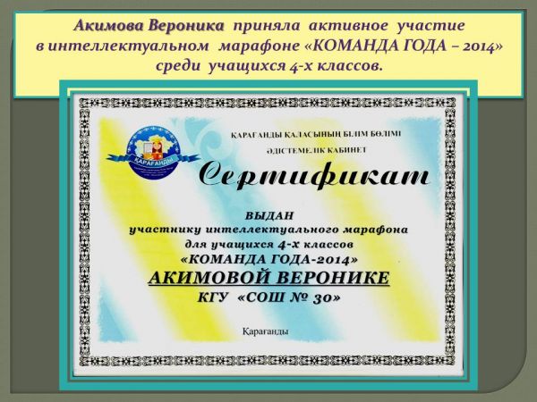 4 сынып оқушылары "Жыл командасы-2014" зияткерлік жарысына белсене қатысып, сертификаттармен марапатталды.